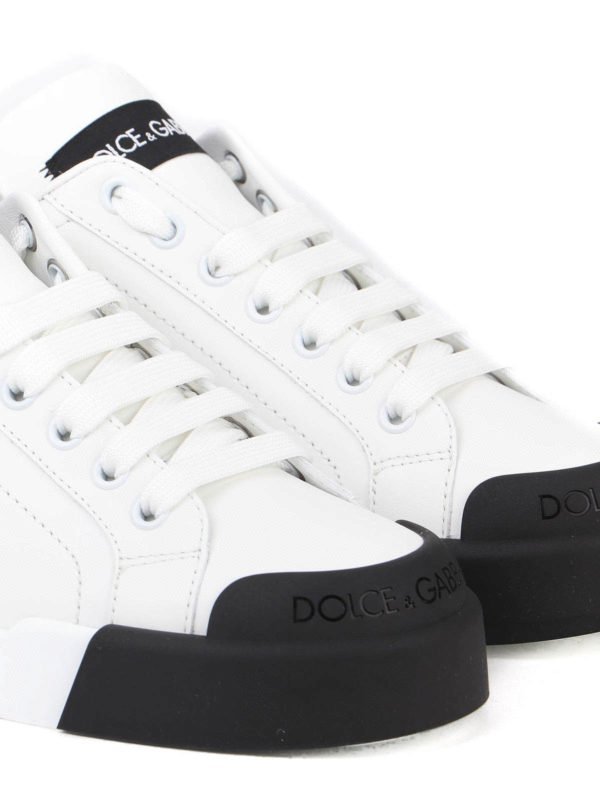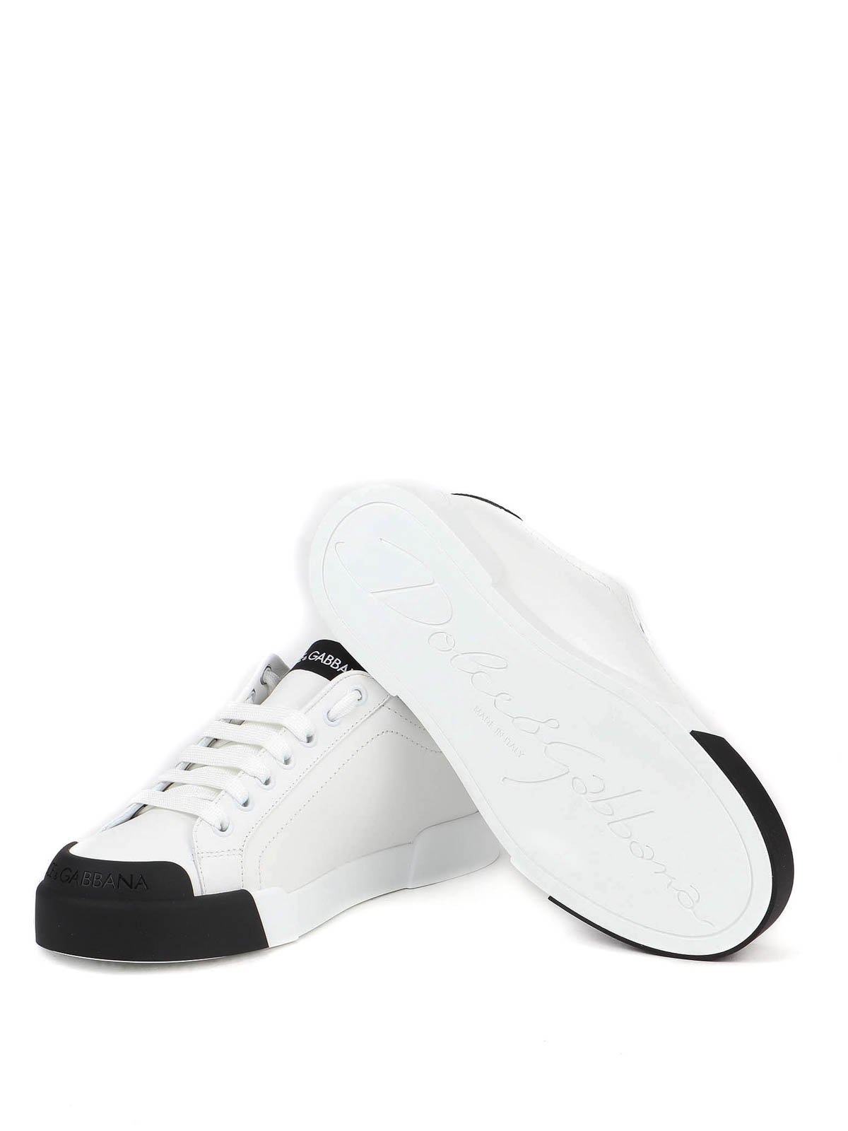 White  leather sneakers with logo on the tongue, side, and contrasting on the heel tab. Rubber sole.
