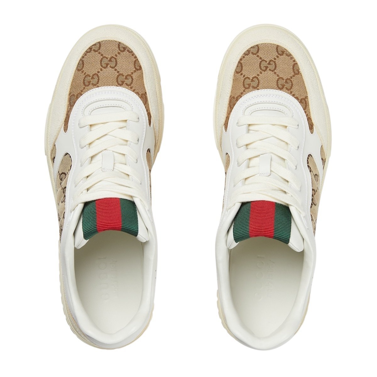 The Re-Web sees Gucci’s heritage stripes as a bold statement detail on a contemporary silhouette. This pair is crafted from the iconic Original GG canvas and white leather. Defined by multiple iconic details, this new sneaker takes center stage with the bold green and red Web tongue