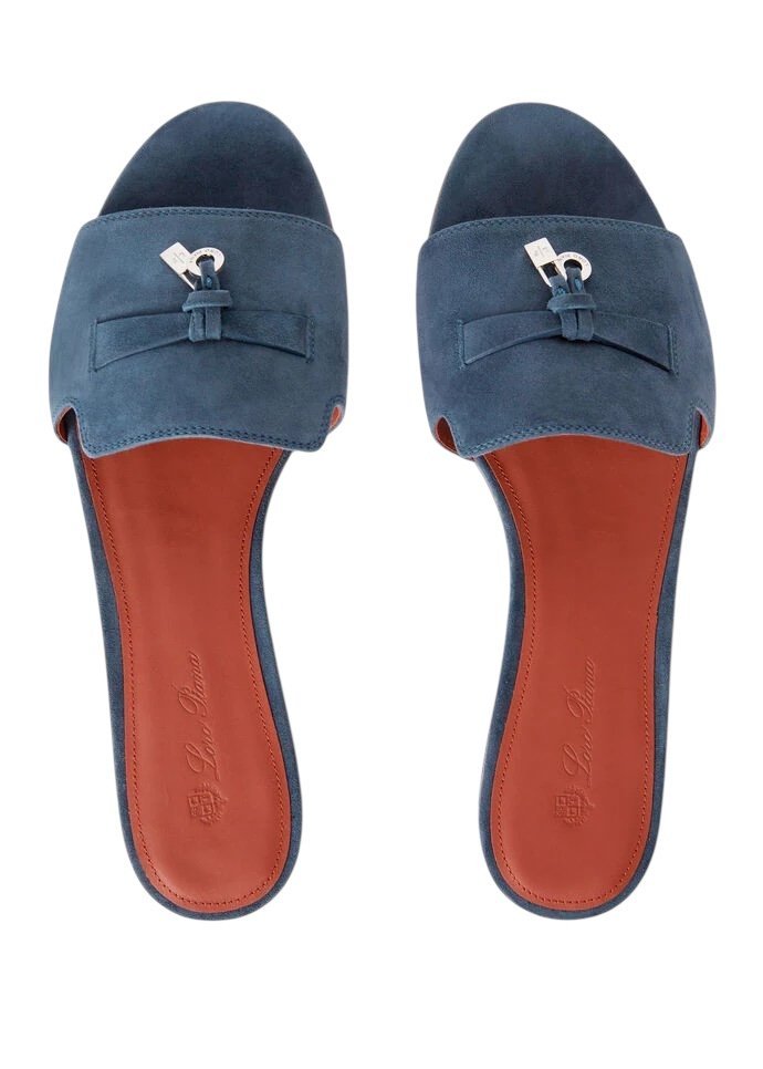 Suede leather sandal, featuring a framed ribbon and a harmonious stitch that carries Loro Piana’s My Charms comments. It’s a luxury feminine shoe, which is suitable for wearthing in the city and during the holidays.