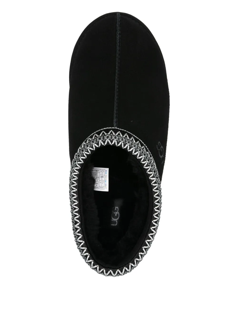 This Tasman Slipper model is made from soft black suede and has an embroidered with Tasman braiding circling the cuff. The lining is made from sheepskin and upcycled wool. The cushioned insole is made from UGG pure upcycled wool. The outsole, with traction fashioned in a starburst pattern, is made from black Treadlite technology. This version is monochromatic and the dominant hue is black.Â